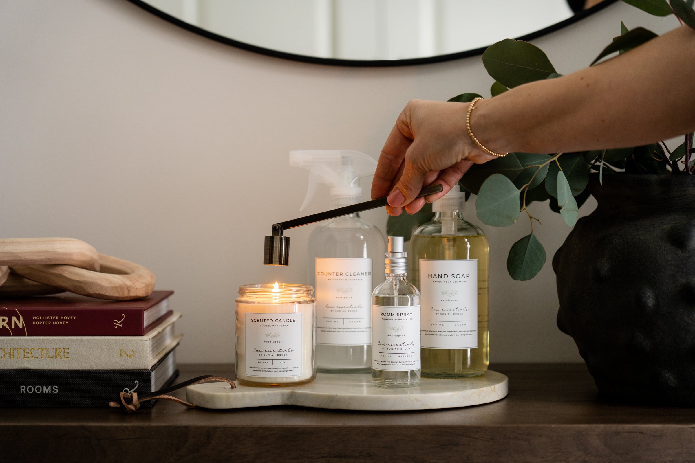 Our lineup combines scent and design with natural ingredients in beautiful glass bottles. Available in 4 signature scents—from counter spray to refillable bottles for dish soap.